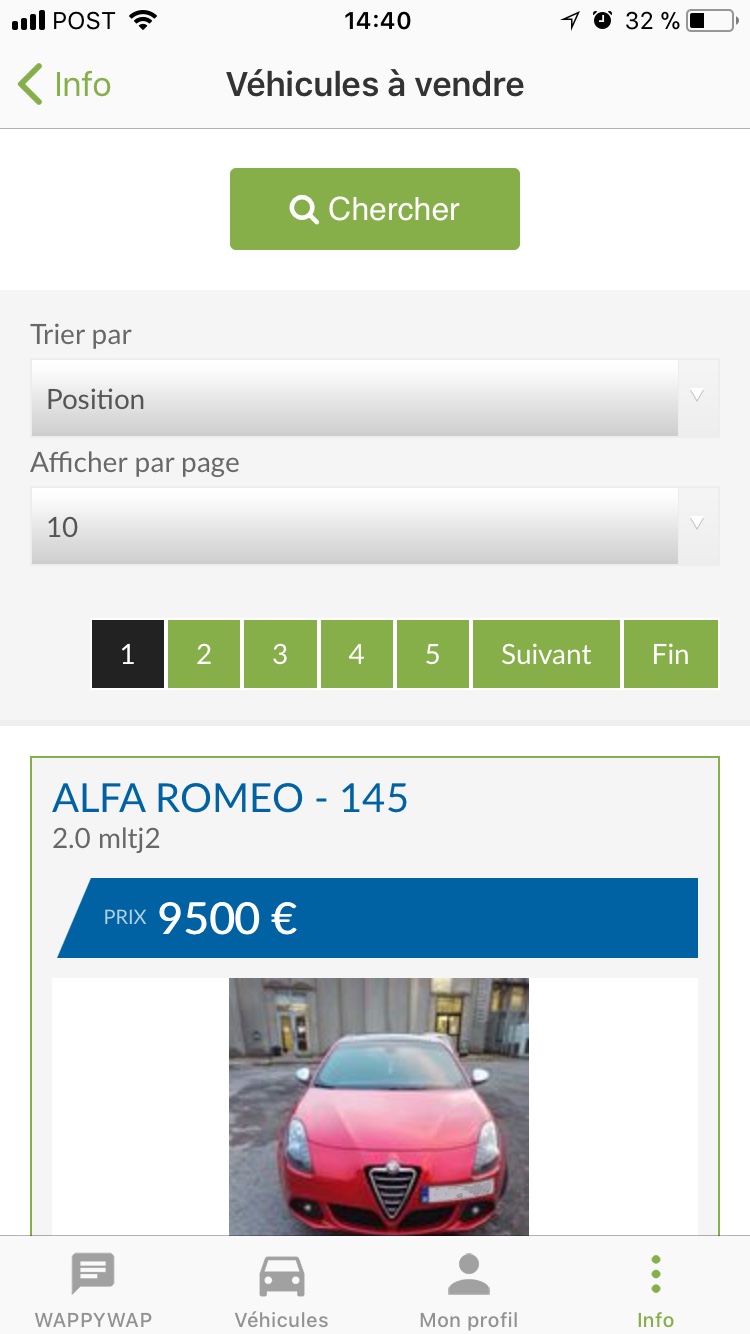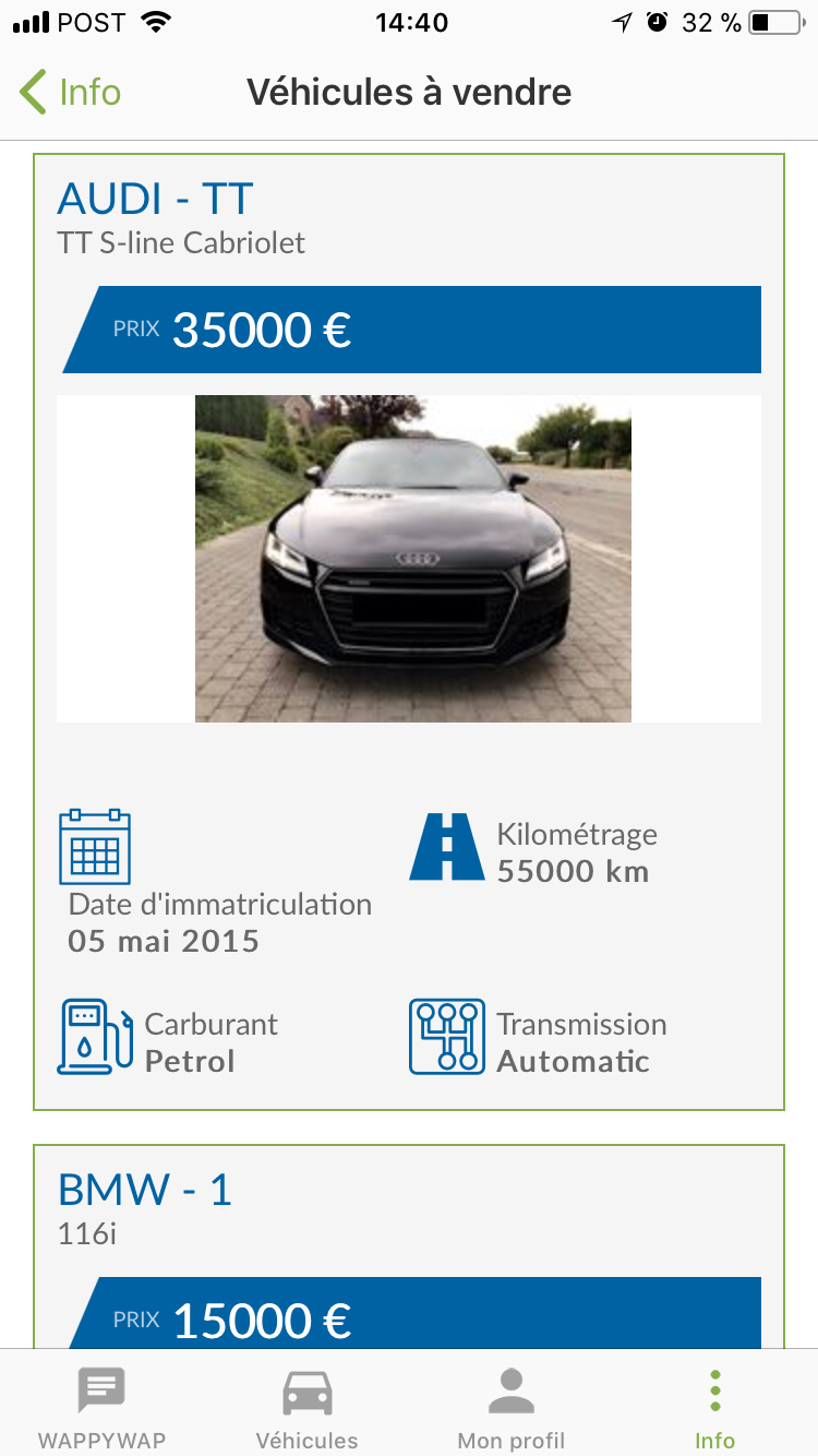 Passons ensuite sur la personnalisation de votre compte. Vous pourrez changer votre photo de profil, ajouter une autre pour votre voiture, indiquer le modèle de celle-ci, son kilométrage et même son prix. Pourquoi me direz-vous ? Simplement car l’application vous permet de mettre votre voiture en vente sur sa plate-forme, la rendant disponible dans une liste WappyWap avec son kilométrage et son prix de vente.